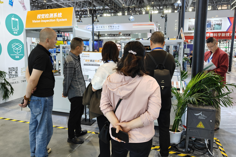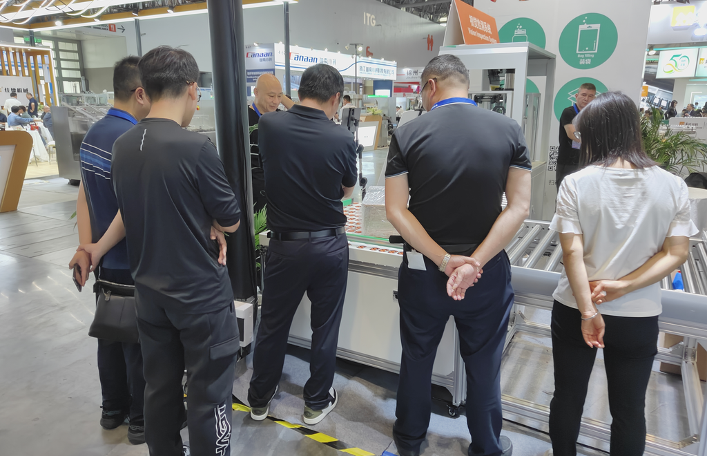 我们还带来了后道工序设备——智能输送系统作为生产线中的关键组成部分,承担了物料的自动化输送、分拣和实时数据采集功能。它的优点有:传送速度快,最高能达到 2 秒 / 个;旋转方向自由,满足最佳转向方式;占地面积小,安装方便;安装维护简单、省时省力。
