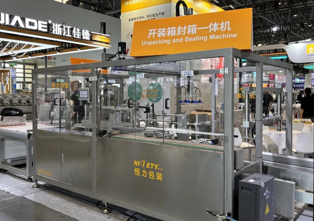 这次展会,我们不仅带来了包装药品的设备,还带来了后道工序的自动化设备,比如上图这台开装箱封箱一体机,大大节省了药企车间的人工需求,从药品的自动装瓶到产品装箱、封箱、码垛一气呵成,智能流水线帮助企业极大地提高了生产效率和产品质量的稳定性。