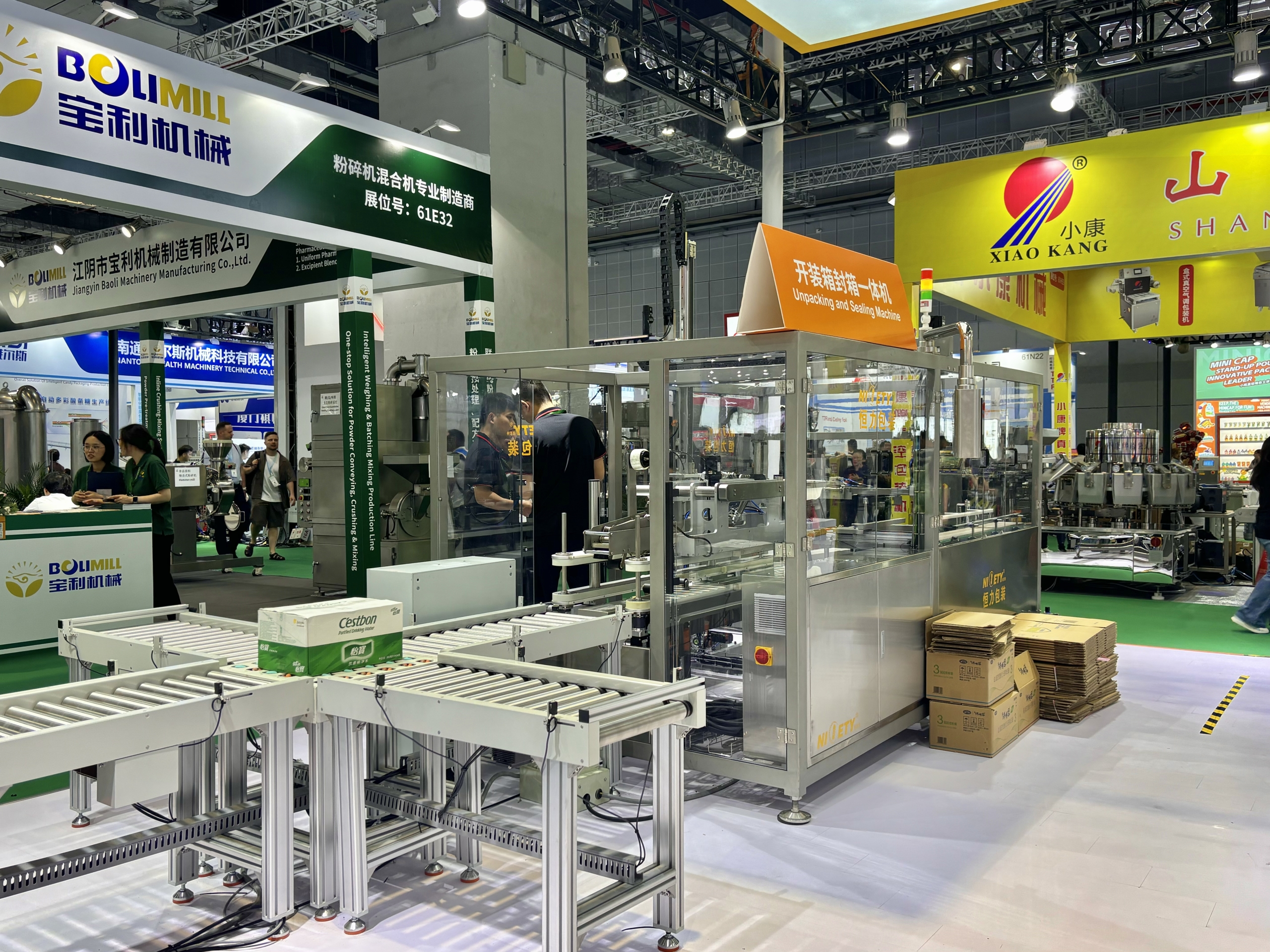 智能开装封箱一体机更是成为现场的焦点,它从开箱、装箱到封箱的一气呵成,更惊艳的是,当它与智能输送系统 “强强联手”,整个后道包装流程瞬间化繁为简。现场参观者们现场参观包装环节的高效运转,纷纷惊叹。