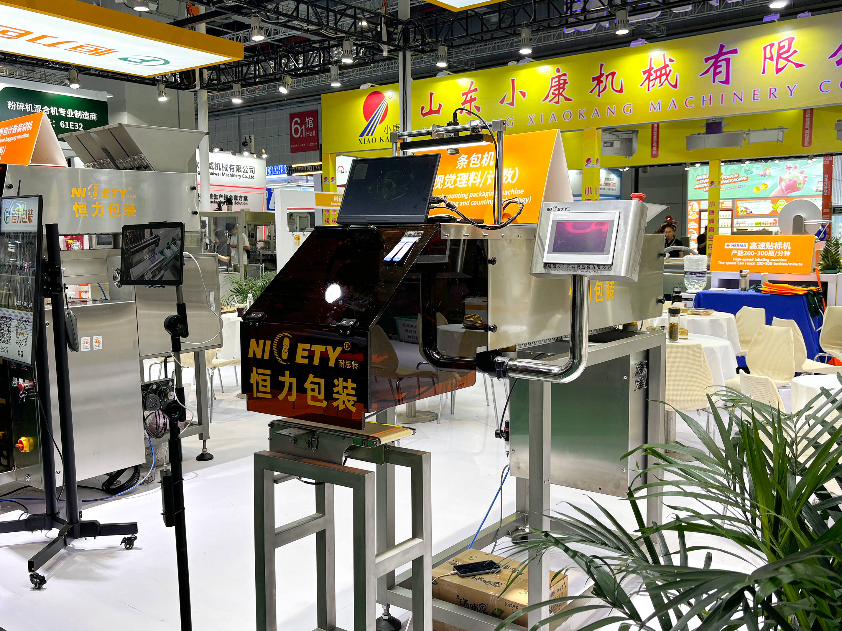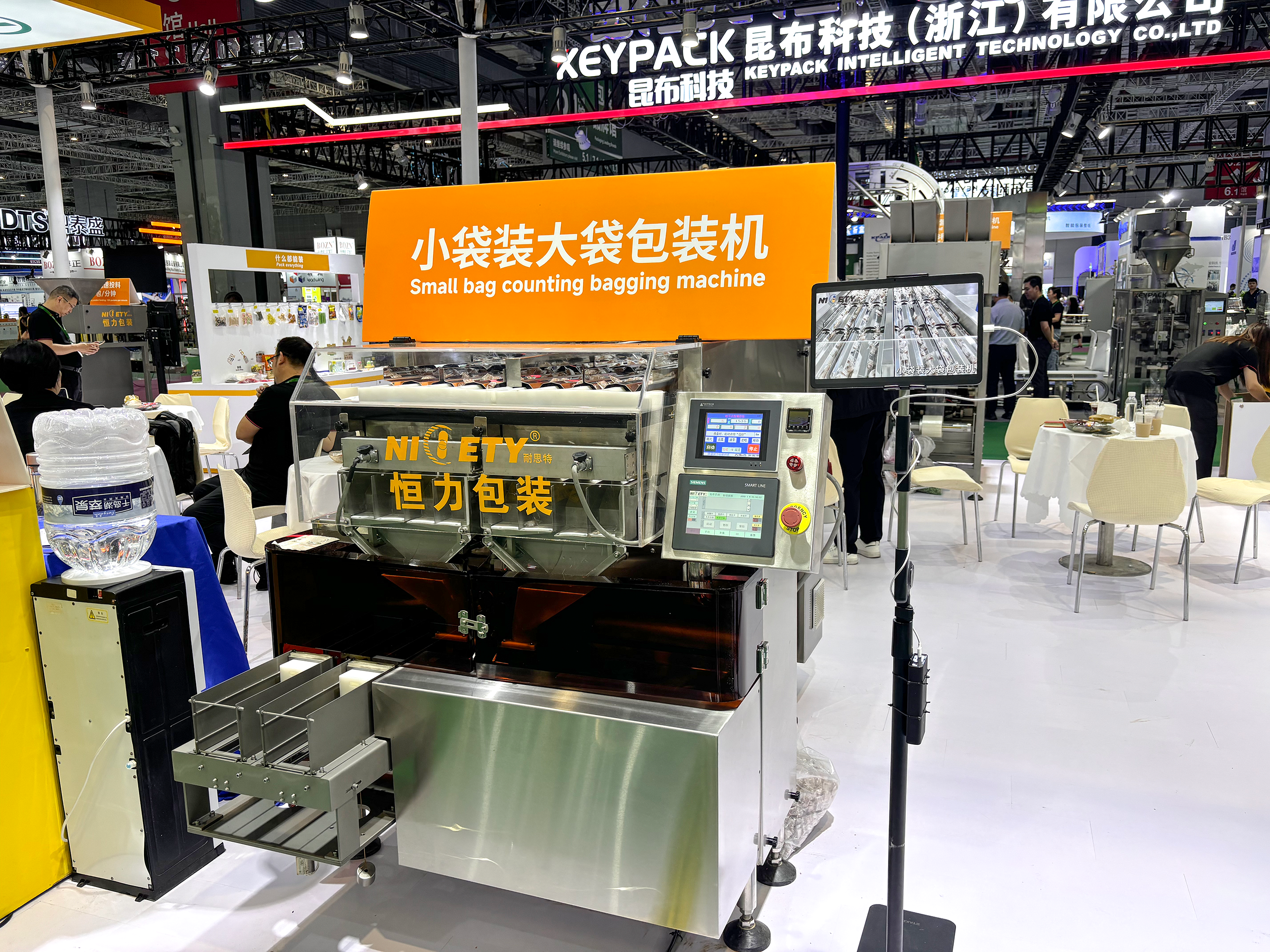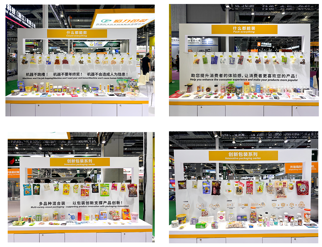 条包理料计数机、小袋装大袋包装机在现场也人气颇高,不少零食厂家都驻足观看。