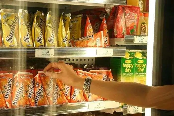 在一堆圆瓶、方盒里,三角包的造型本就足够独特。再搭配鲜亮的色彩和水果图案,瞬间就能从货架上 “跳” 出来,吸引力直接拉满。
