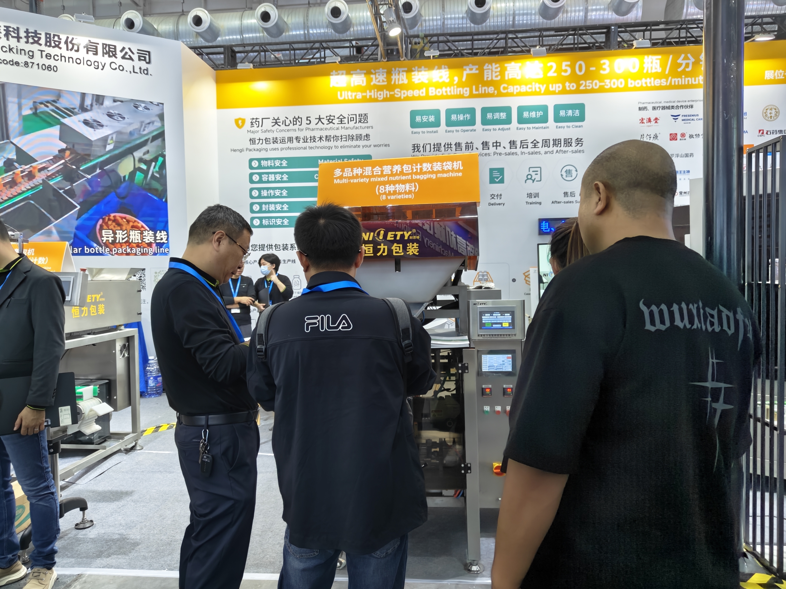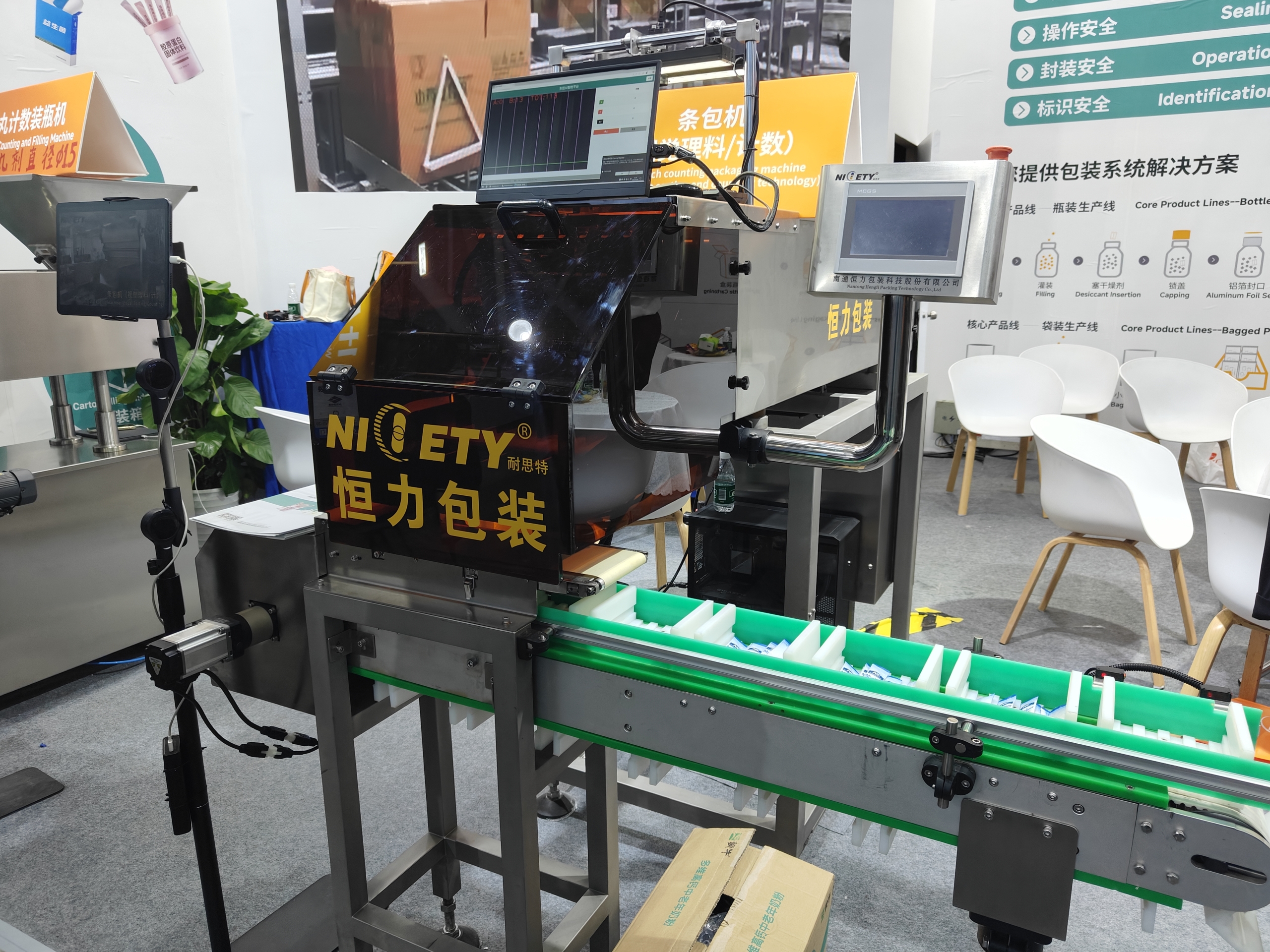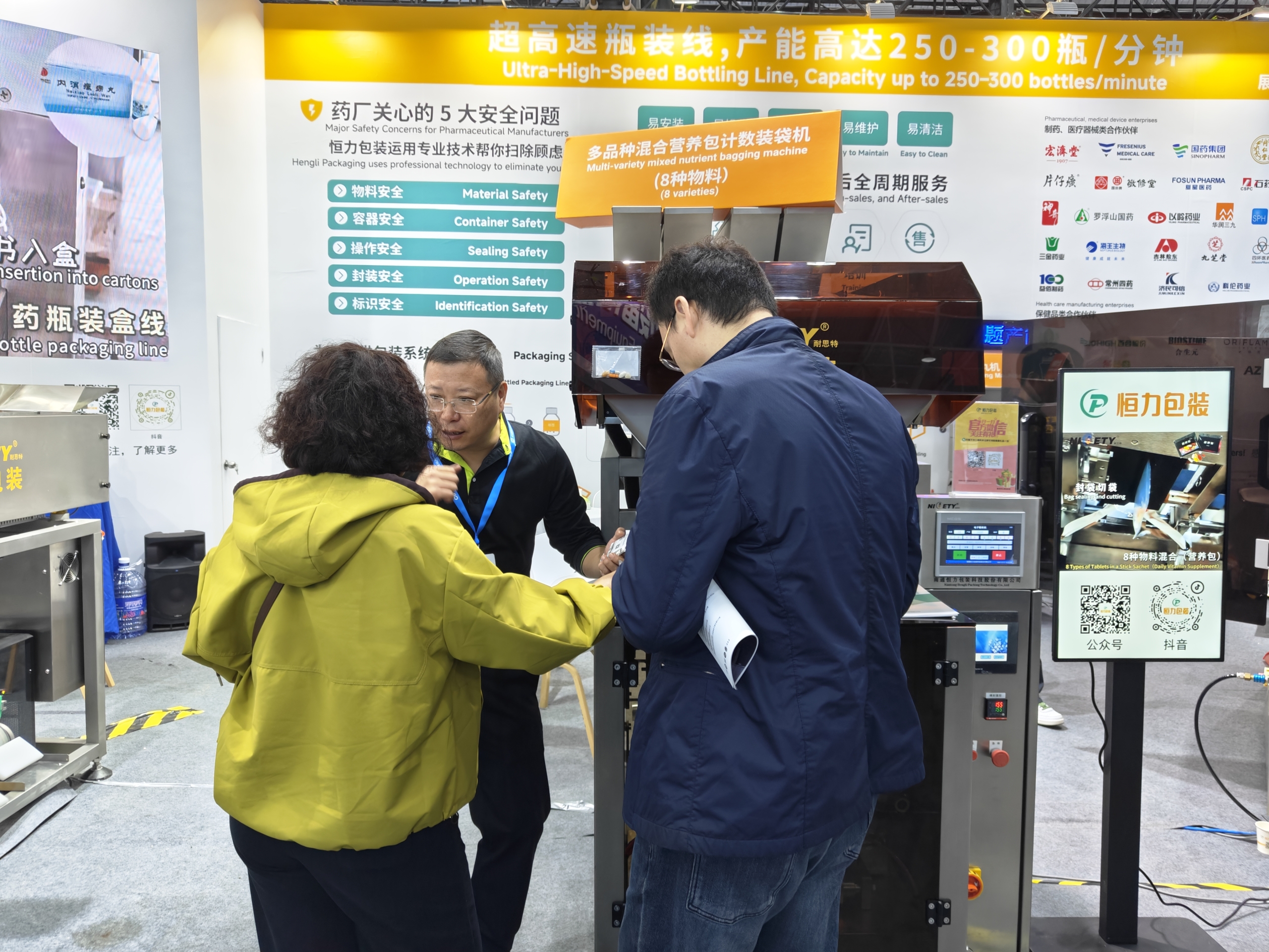 在条包类药品(如冲剂、散剂)生产领域,我们的条包机以 “视觉理料 + 精准计数” 的双重优势,成为展会的 “全能代表”。设备不仅能通过视觉识别技术实现物料的自动理料、排序,确保每一根条包的物料填充量均匀一致,还能根据需求灵活调整条包规格(如长度、宽度),适配不同包装场景,这台机器在现场也受到了很多保健品客户的青睐。