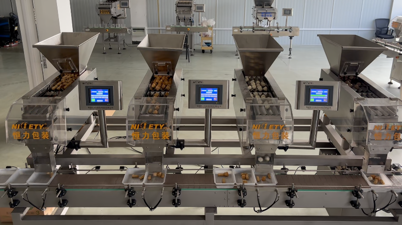 通过多台数粒灌装设备完成不同食材的组合,轻松实现火锅丸子的混合包装。前端的智能管理系统接收订单,下达指令给后道的各项包装流程进行自动化的包装工作:提升机输送物料,光电眼感应装置精准识别预制菜中的不规则食材,任意形状、大小和材质的火锅丸子食材,都能够实现准确计数。