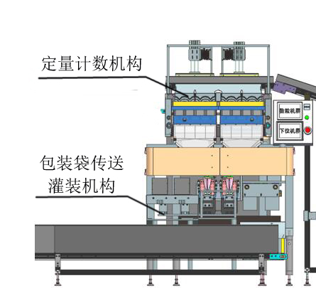 新品样机主要由送料机构(物料提升和推料机构),物料定量计数机构(振动送料和定量计数机构),包装袋传送灌装机构(取袋、送袋、扩袋、物料装袋、振动匀料和封口机构)等部分组成。集合送料、计数、灌装于一体,可以在保证产品物料不受损坏的前提下,实现又好又快的自动化包装。