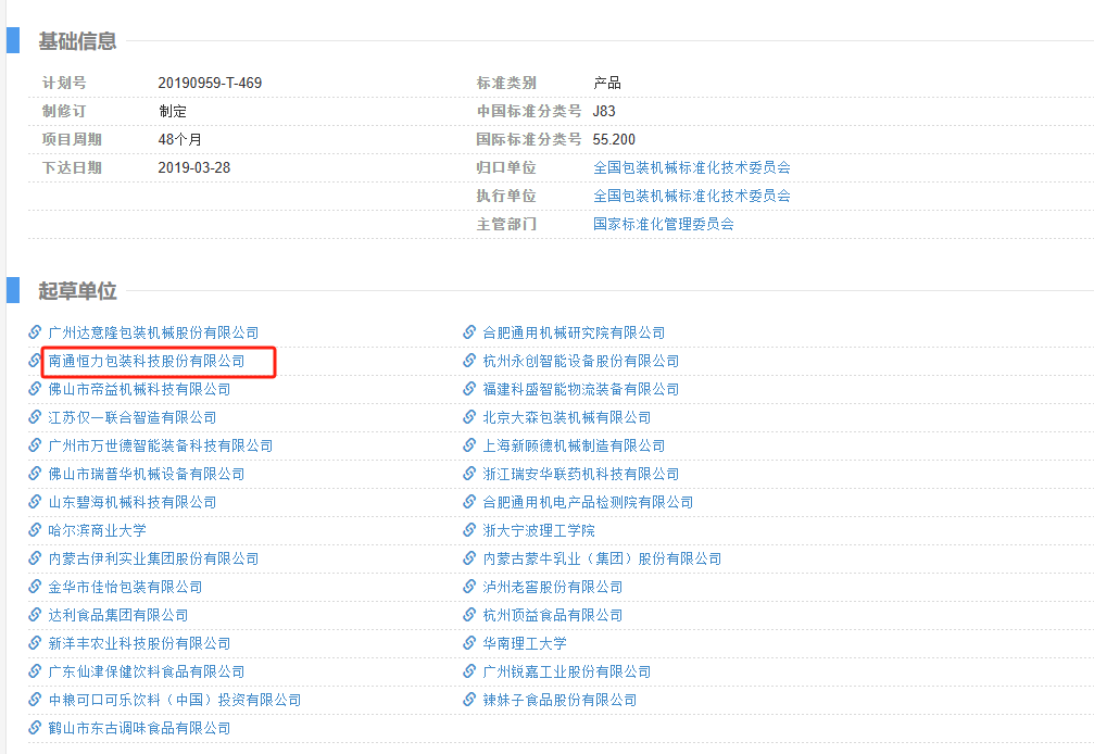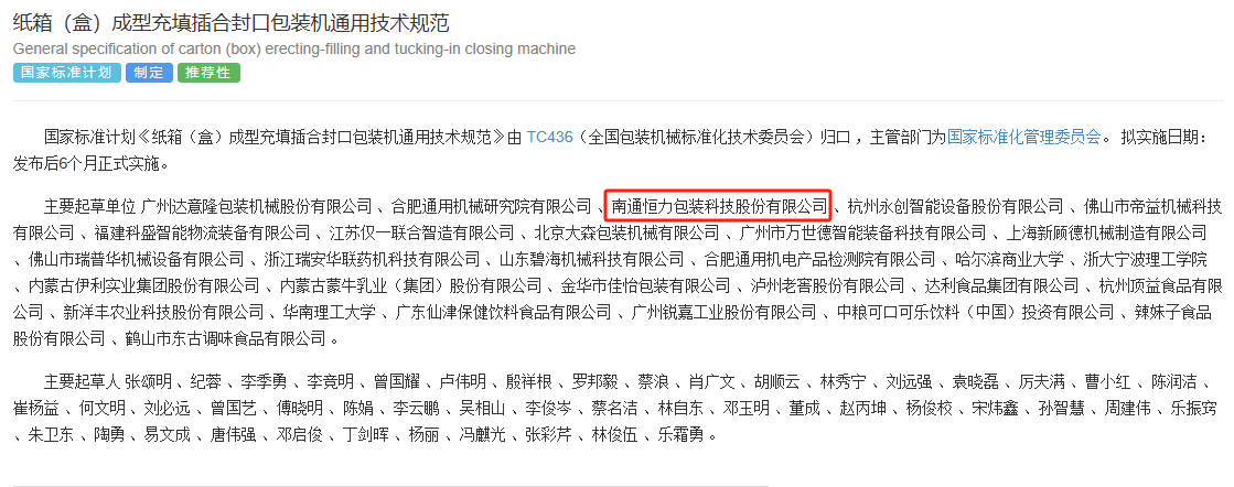 翻看这份新鲜出炉的行业标准,起草单位不止有自动化包装行业的相关翘楚,伊利、蒙牛、可口可乐、辣妹子等知名品牌也赫然在列,还有众多高校的技术专家加持,足以可见参与制定单位的权威性。(恒力包装参与其中,也是与有荣焉谈啦~)